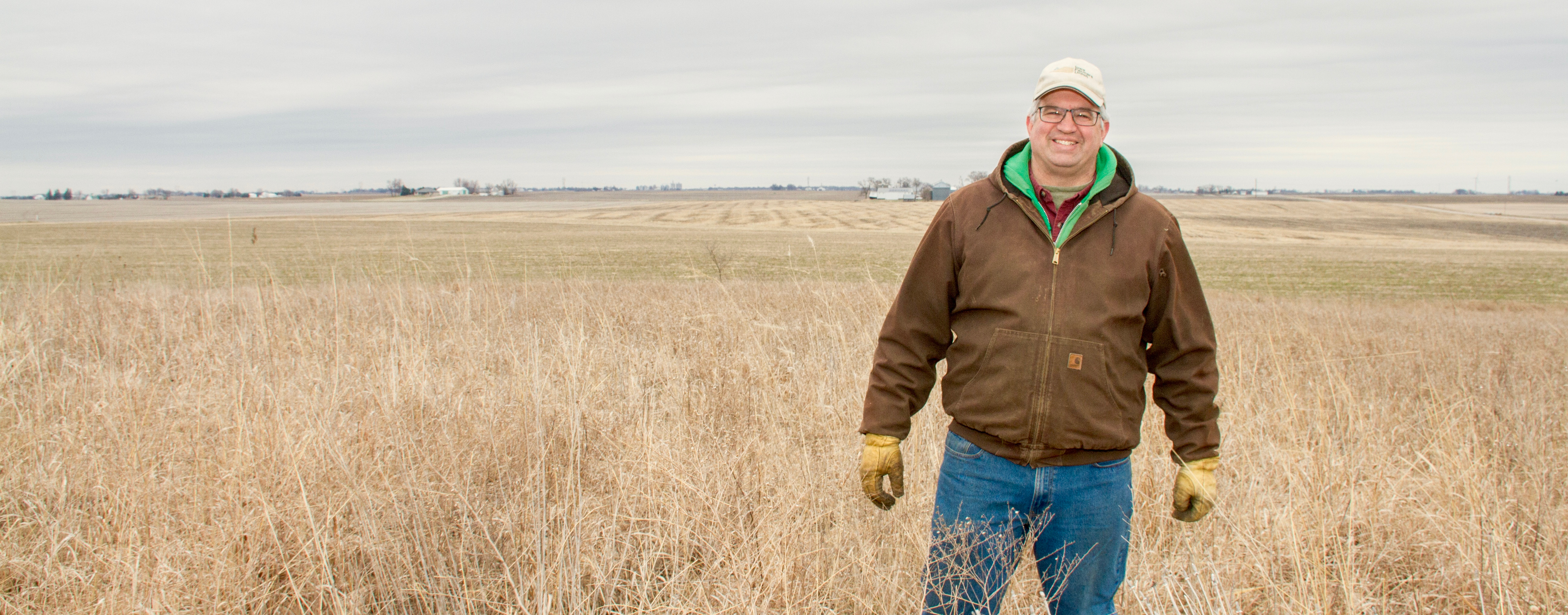 Aaron Lehman is rediversifying the family farm with an extended crop rotation and native habitat restoration. Here, he stands in reconstructed prairie with organic fields in the background.